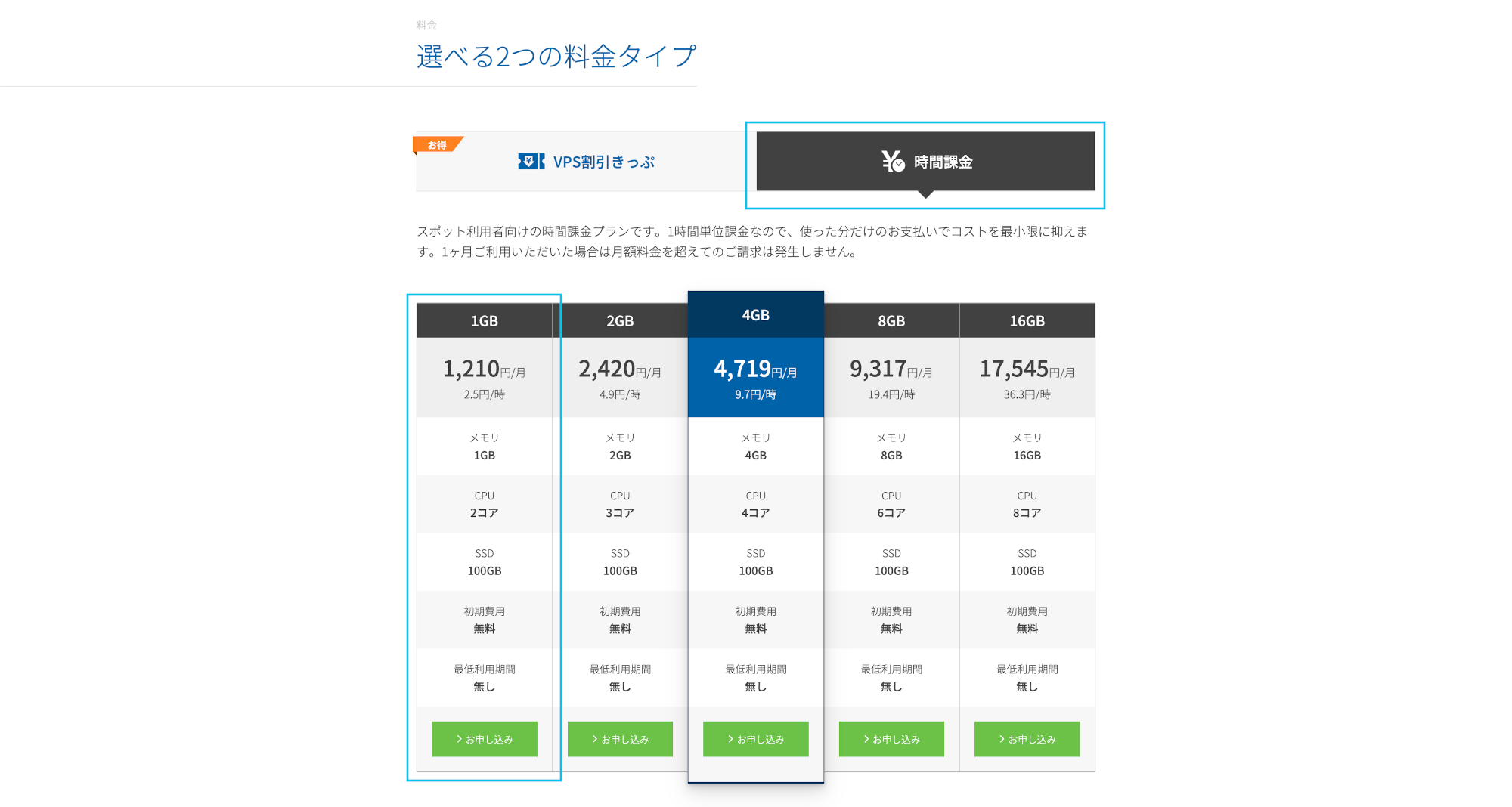 「時間課金」から選択することで、最低1時間の最大1ヶ月単位で契約することができます。