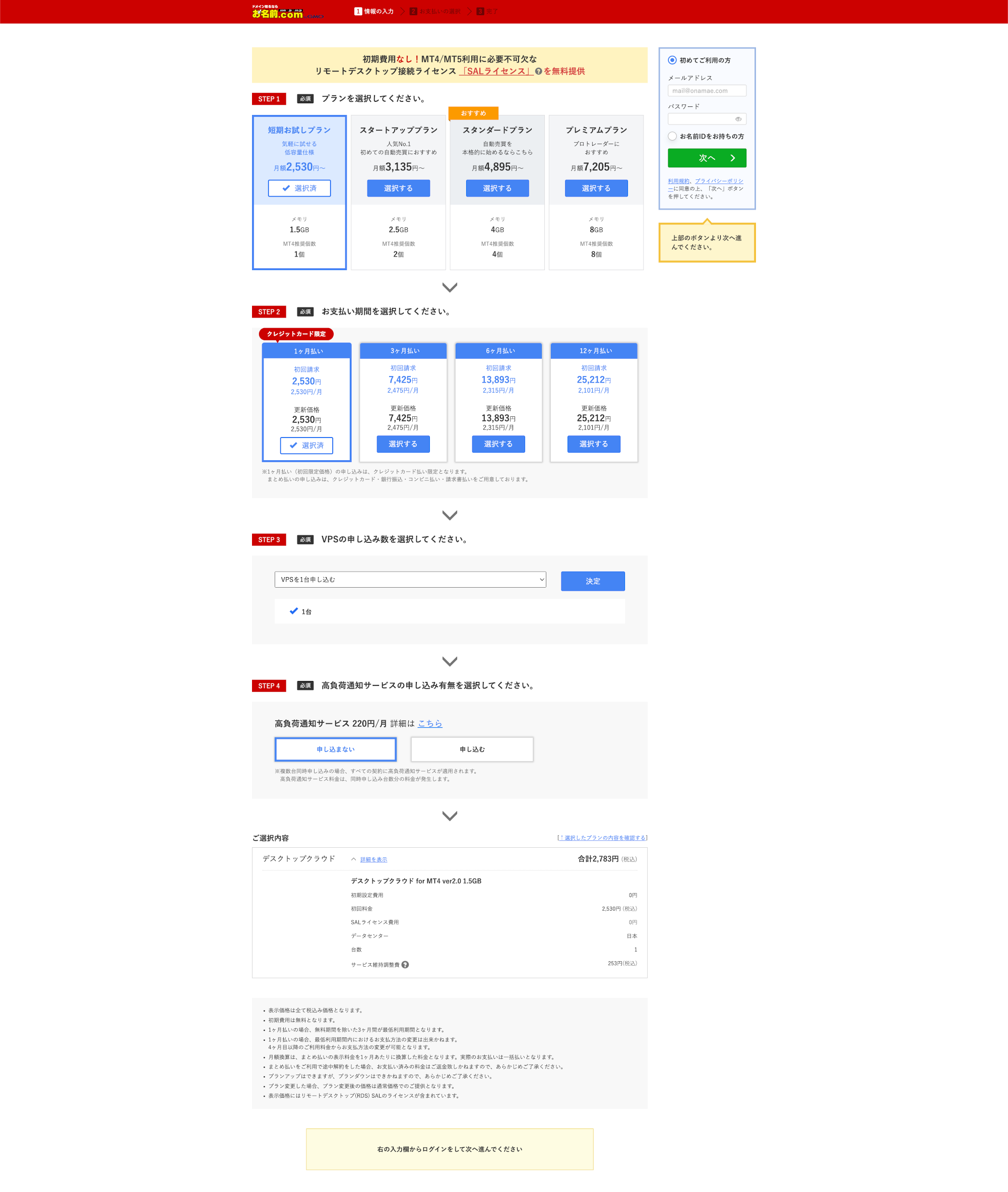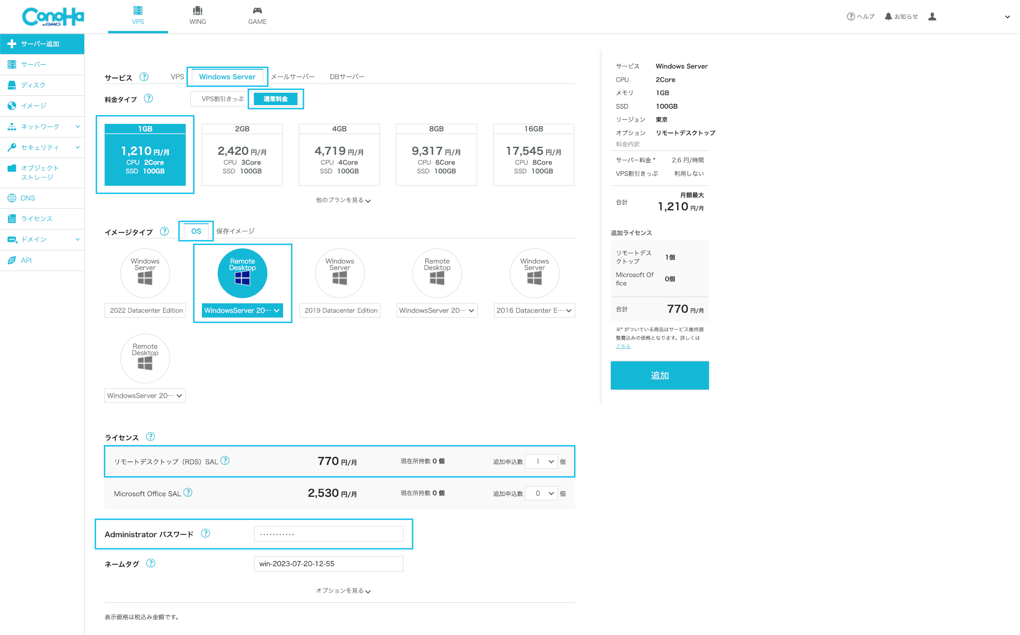 ログイン後、「VPS」の「サーバー追加」から改めて次の順番でプランを選択します。