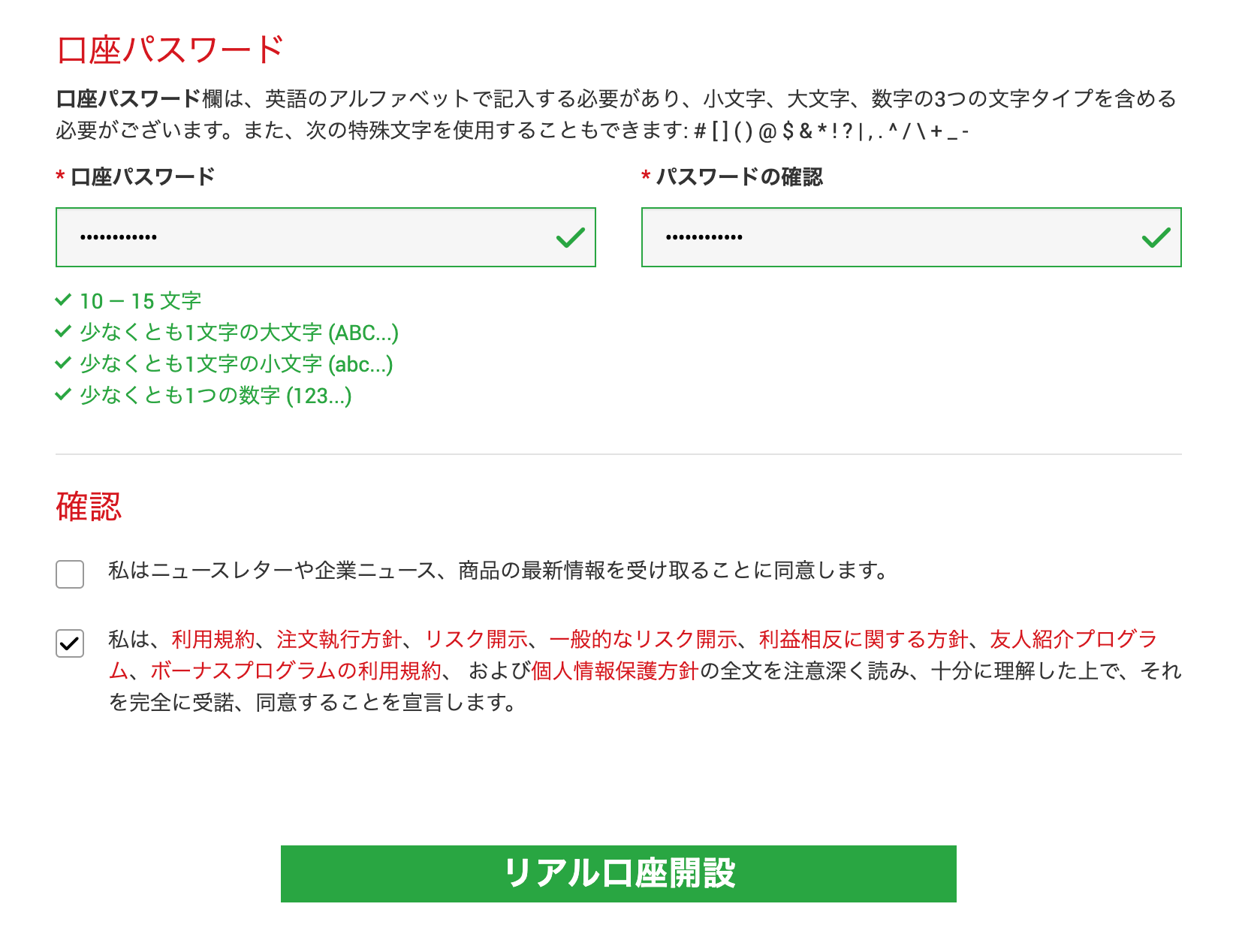 - 口座パスワード(アルファベット小文字、大文字、数字を含む)