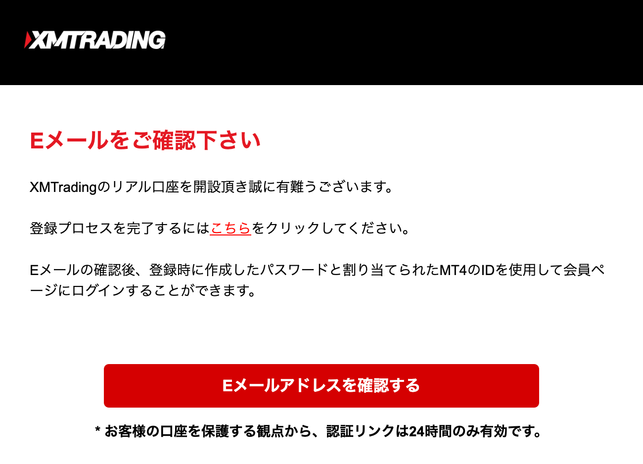 登録Eメールアドレスに「XMへようこそ」のメールが届きますので、本文内にある「Eメールアドレスをご確認下さい。」をクリックします。
