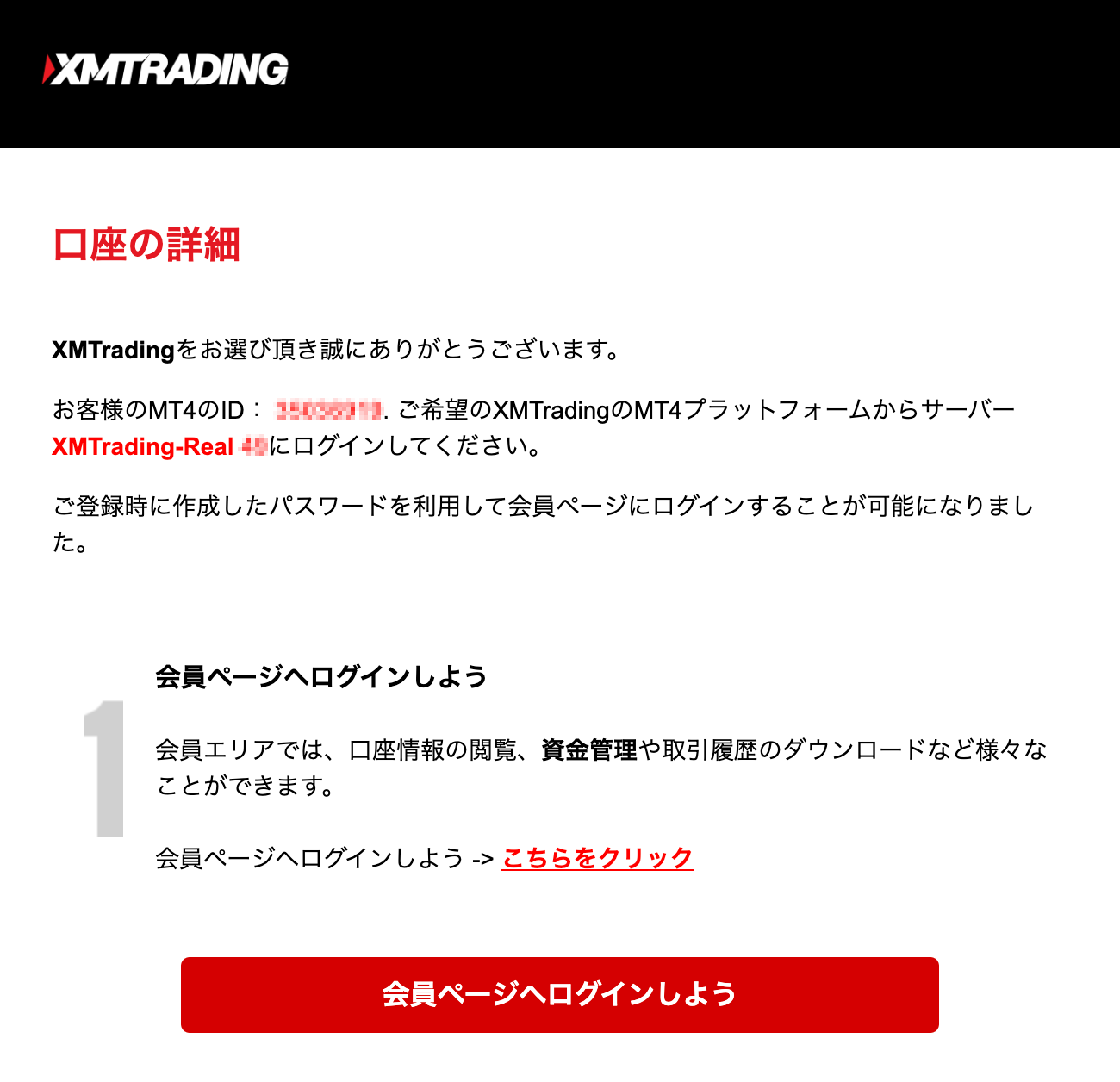 本登録完了のメールが届きますので、本文内にある「MT4のID(口座番号)」と「サーバー名」をメモ帳などに控えます。